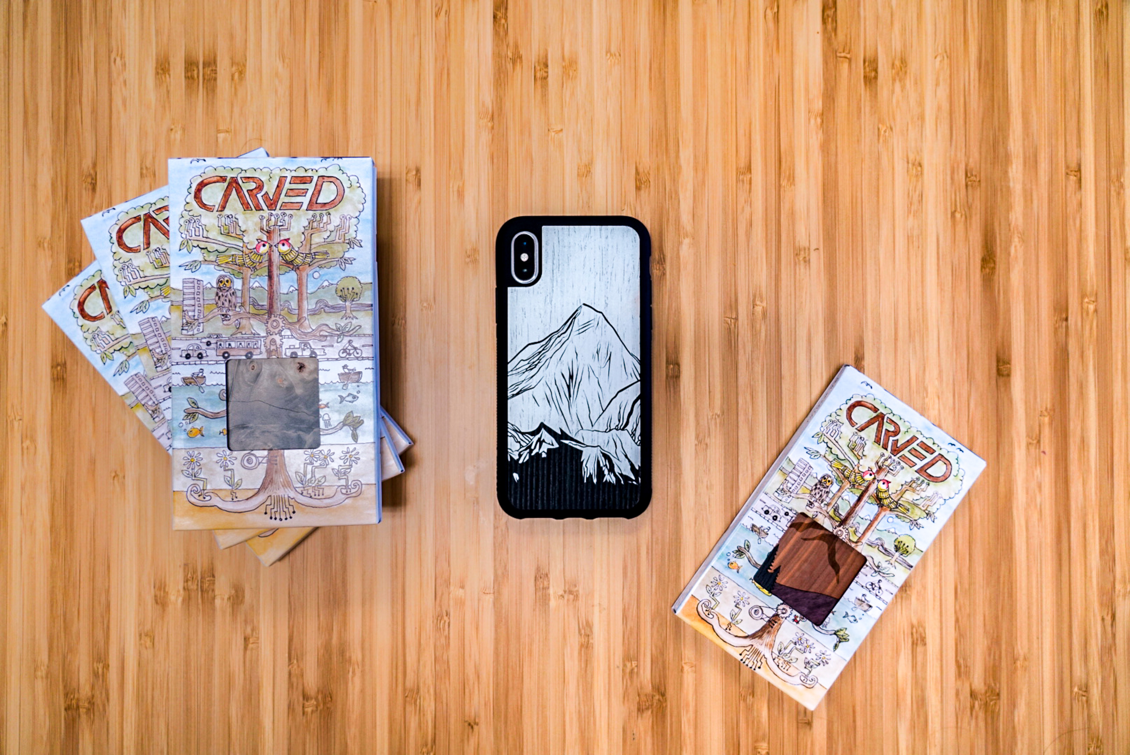 Carved got its start back in 2011 when John Webber and Grant Sassaman bought a CNC machine and started making wood veneer stick on backs for the iPhone 4, iPad 2, and Kindle Fire. After a friend suggested putting a bumper and the wood back together, and after 2 1/2 years of experimenting, their first solid wood phone cases were born.