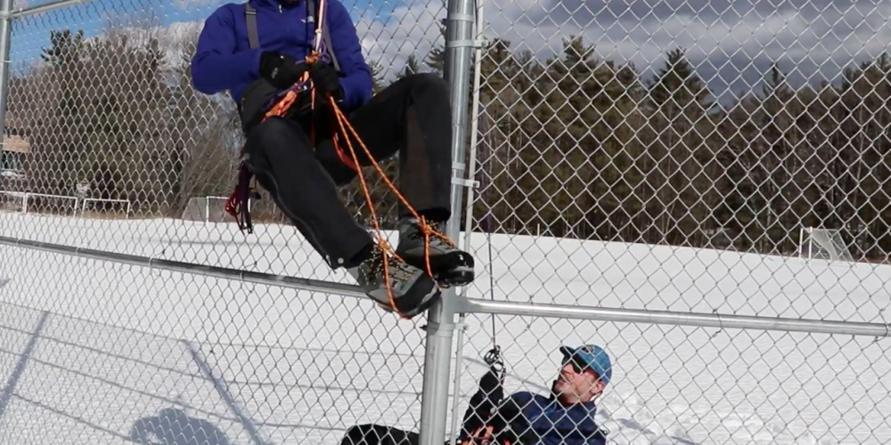 This is how to get creative with your surroundings when you need to train! Ryan Sarka and Ethan Lee utilize a baseball backstop in Keene, NY to demonstrate using a Texas foot prusik and a left-handed ascender for crevasse self-rescue during a “BTP: Expedition Denali” training exercise.