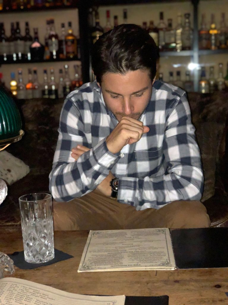 We grabbed a seat at the couches in the lounge, surrounded by an awe-inspiring selection of my favorite liquor, and took way too long to order! Decisions, decisions…