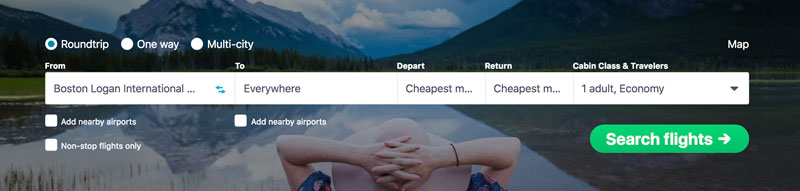 Just enter the city or airport you’re starting from, leave the “to” field blank and it will show “everywhere,” and then for depart and return, select cheapest month. Then you’ll get a list of countries you could visit, at what starting fare, and then you can select cities and itineraries from there.