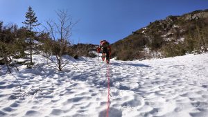 We used a 30 meter 8mm glacier rope, shortened with front and back kiwi coils, tied in our prusik knots, and had fun hammering snow pickets for running belays. Of course, this slowed our progress climbing up the gully, but it was for the best because much of the slope consisted of solid ice sun cups and by drop in time, it had mostly softened to the most perfect Spring corn.