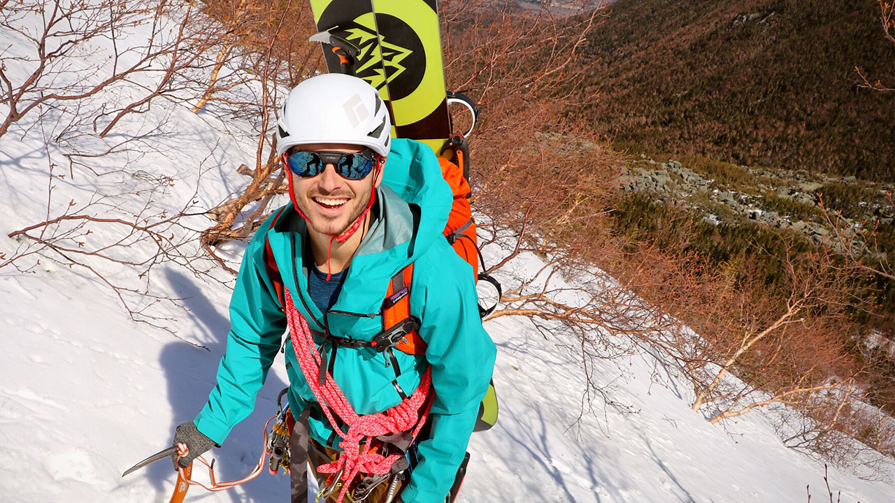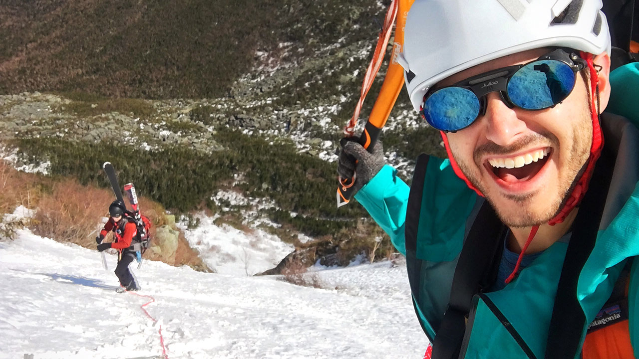 Topping out on our route, we sat for a snack at 5,198 feet. After transitioning to ski and ride mode, Andrew edged his first turns into the face as I set the DJI Mavic Pro drone loose upon the sky. This was the first time I had flown it for any sort of follow on a ski descent and it was so cool to watch Andrew tackle the gully from that perspective.
