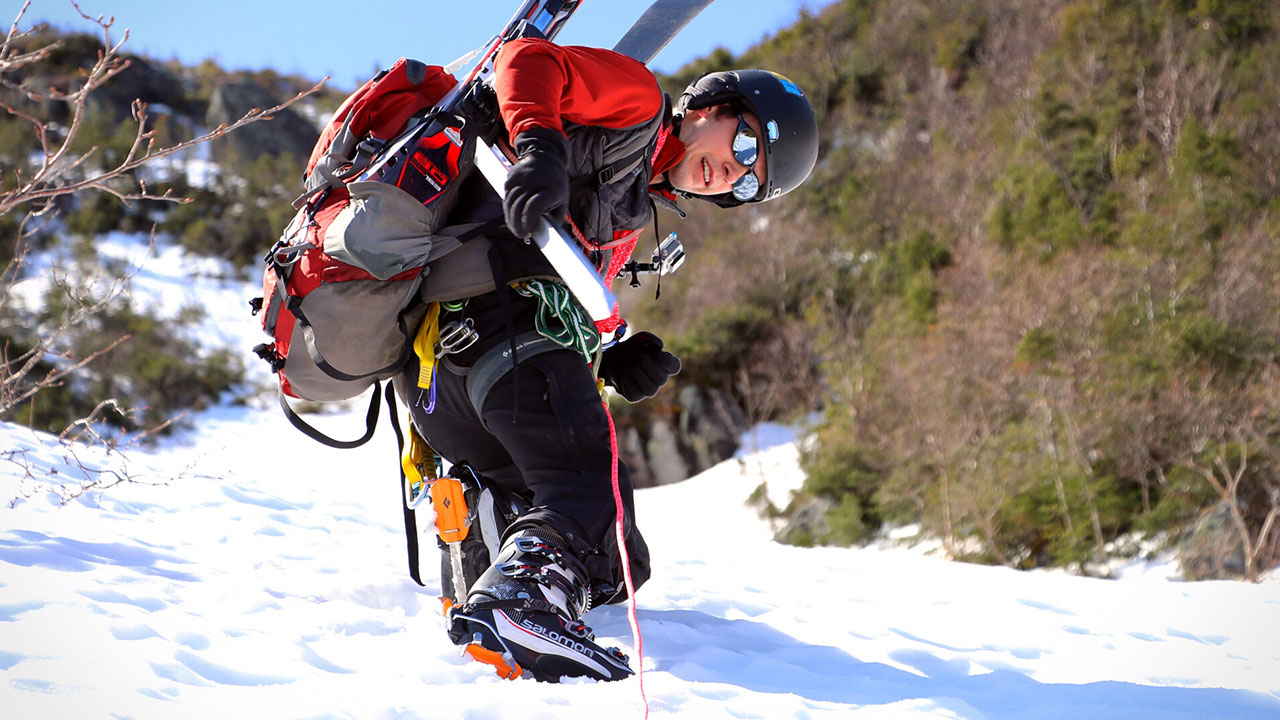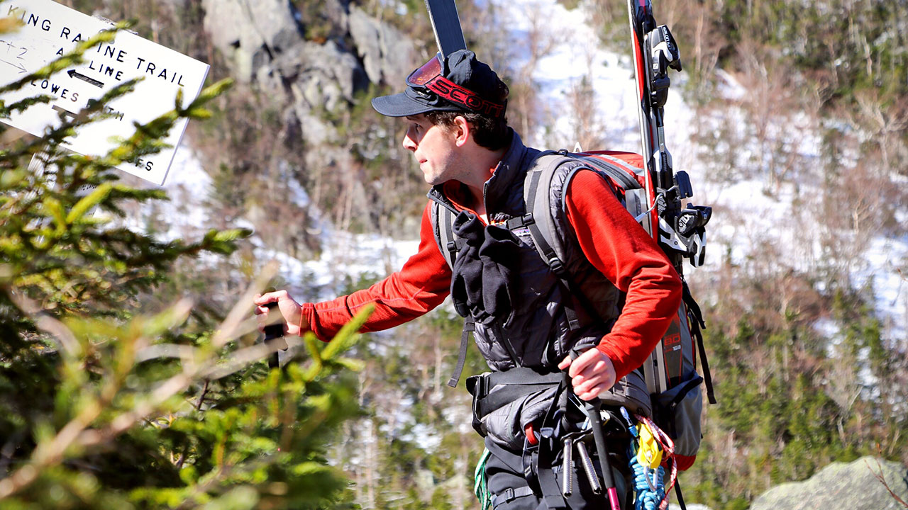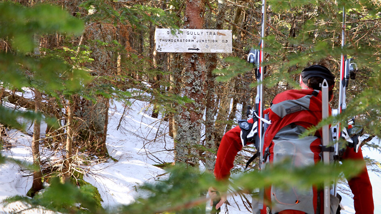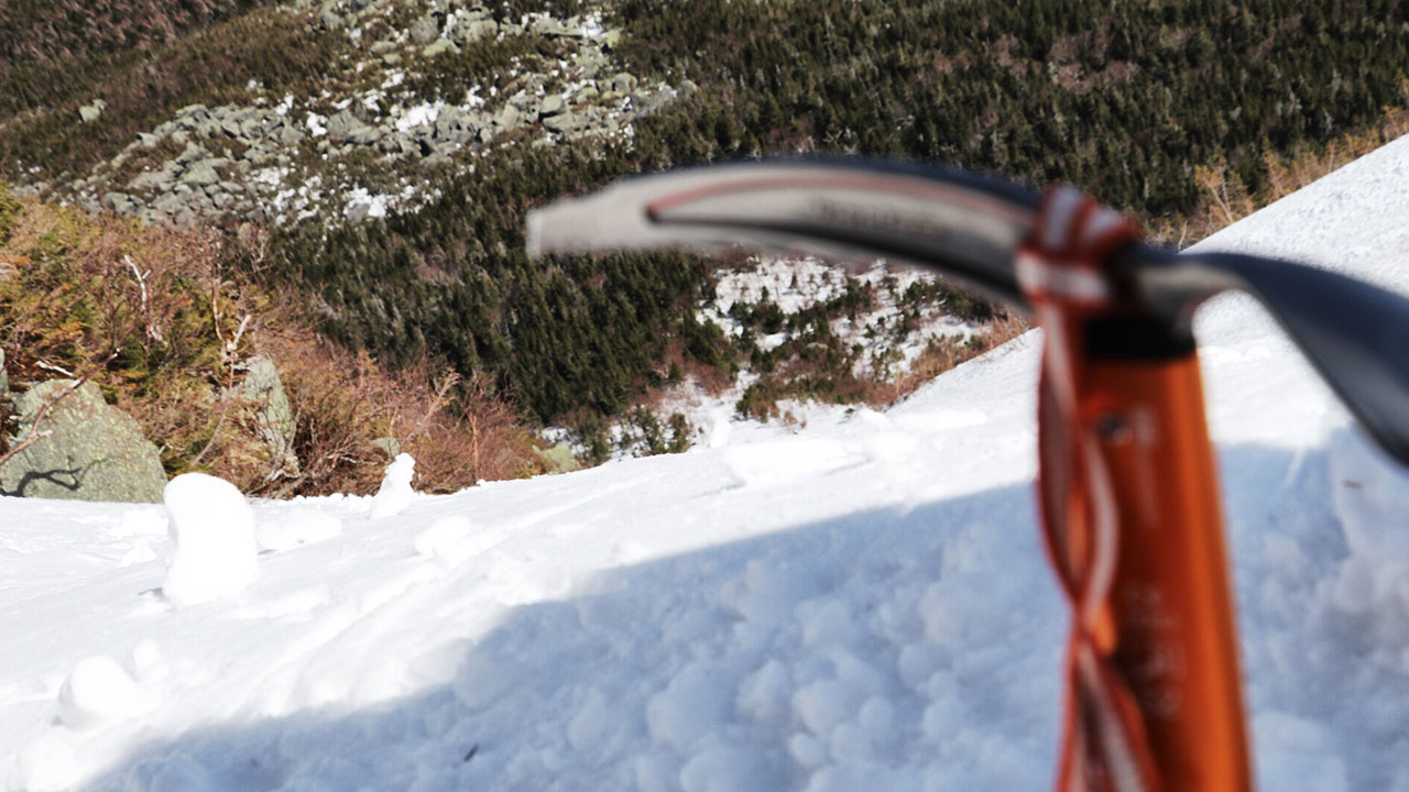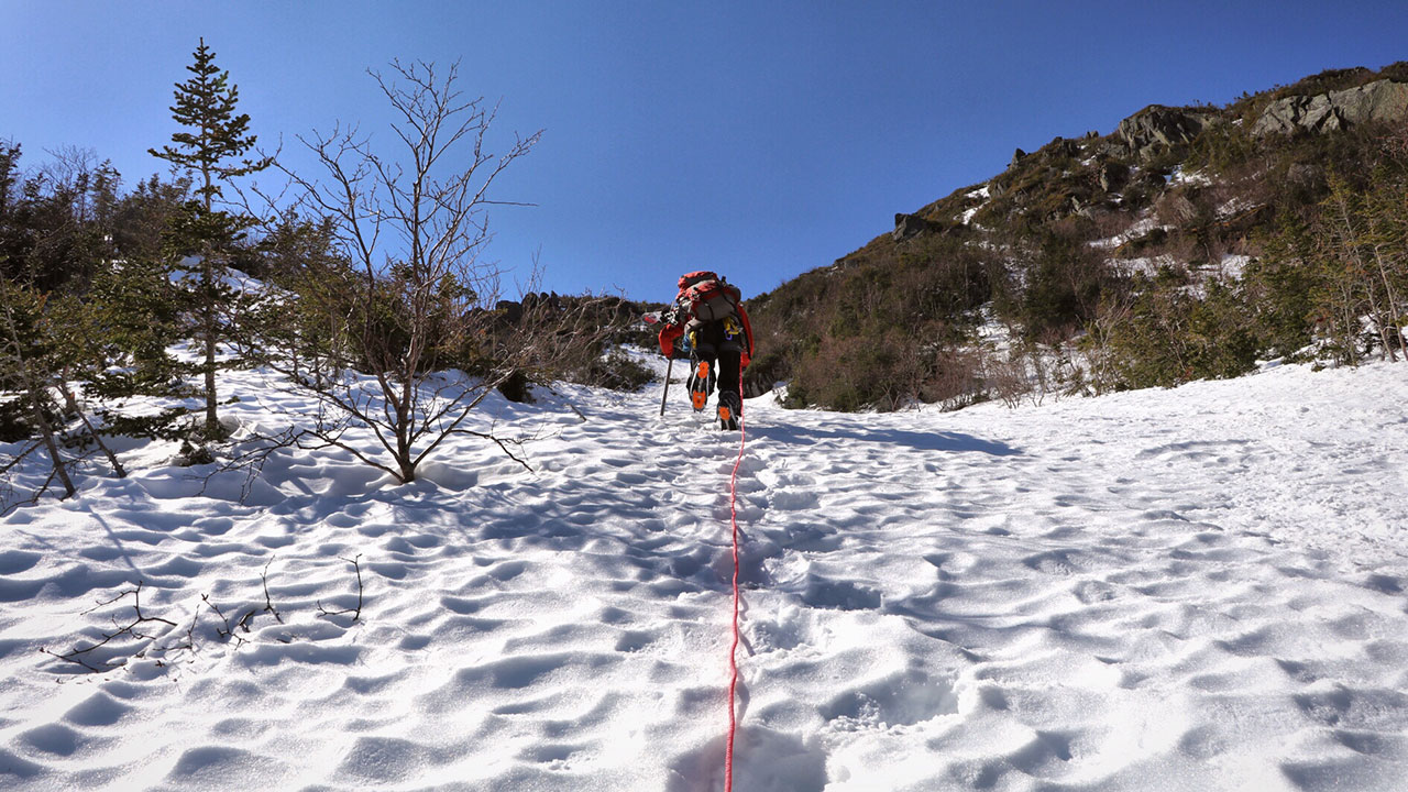 From the Appalachia parking lot, where we had parked and stayed the night, we set out on the Airline trail, linked up to Short Line, then to the King Ravine Trail, and finally the Great Gully Trail. We covered the nearly 4 miles to the ravine in good time and set our bags down to put the poles away, get the axes out, and toss the crampons on.
